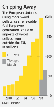 The wood-pellet market is booming because the European Union has rules requiring member countries to generate 20% of their electricity from renewable sources by 2020. Europe imported €66.2 million (about $92.6 million) of pellets and other wood-based fuels in the first three months of 2009, up 62% from the same period a year earlier, according to the EU's statistical arm.