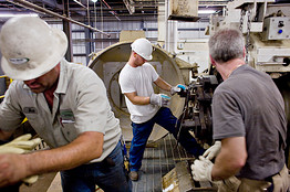 Green Circle employees race to repair one of the pellet mill's dies that give the pellets their compacted cylindrical shape at the plant in Cottondale, Fla., July 1.